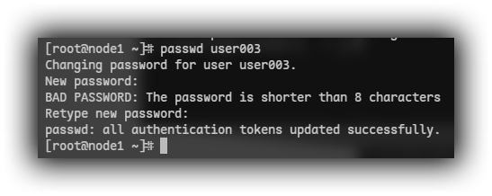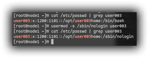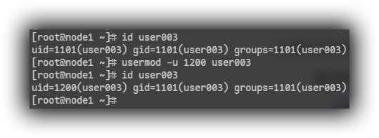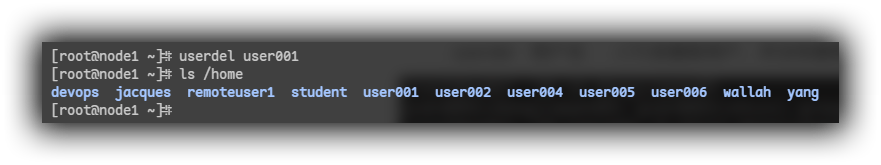 1 | userdel -r user002 //添加 -r 选项 删除用户同时删除用户的家目录。 |
