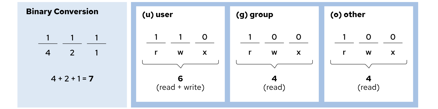 数字的计算方法是: 将每个权限的数值加在一起, 其中4代表r(读取), 2代表w(写入), 1代表x(执行)。